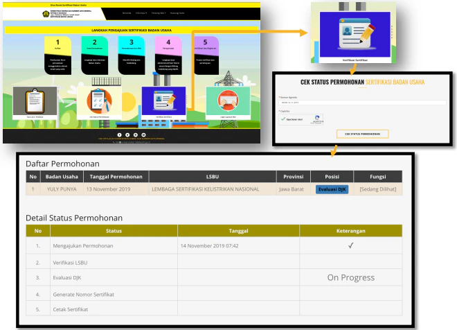 Proses dimulai ketika LSBU mengajukan permohonan registrasi sertifikat badan usaha melalui aplikasi SI UJANG GATRIK yang dapat diakses di www.siujang.esdm.go.id. Setelah dokumen permohonan diunggah ke dalam sistem, aplikasi secara otomatis menghasilkan notifikasi permohonan registrasi sebagai tanda bahwa pengajuan telah diterima oleh sistem.