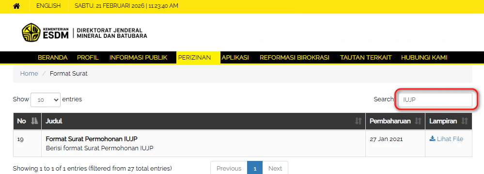Ketik “IUJP” Pada kolom pencarian yang tersedia. Selanjutnya, Anda bisa klik pada bagian “Lihat file” kolom lampiran untuk melihat atau mengunduh file drafnya.